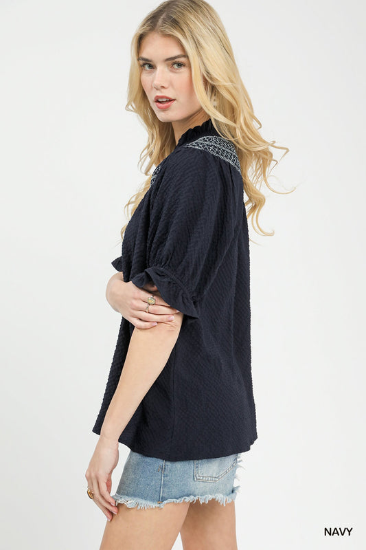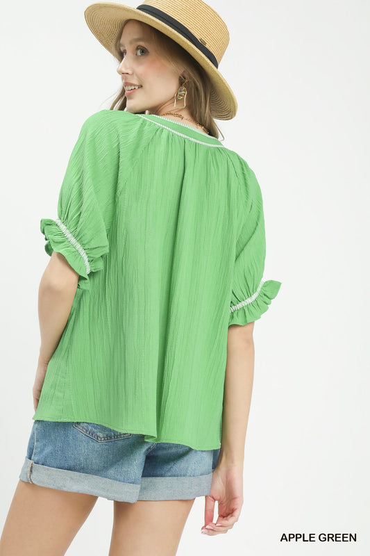 Textured Split Neck Puff Sleeve Top
