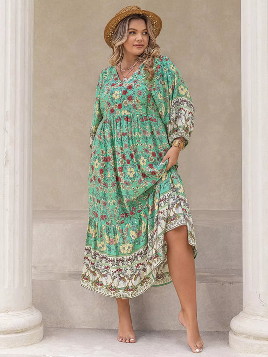 Plus Size Bohemian Floral Print Long Sleeve Midi Dress