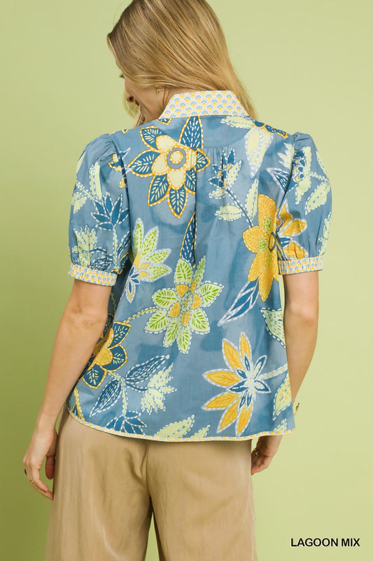 Umgee Mixed Abstract Print Puff Sleeve Blouse