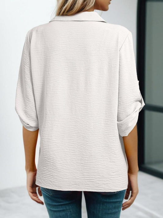 Johnny Collar Roll-Up Sleeve Blouse