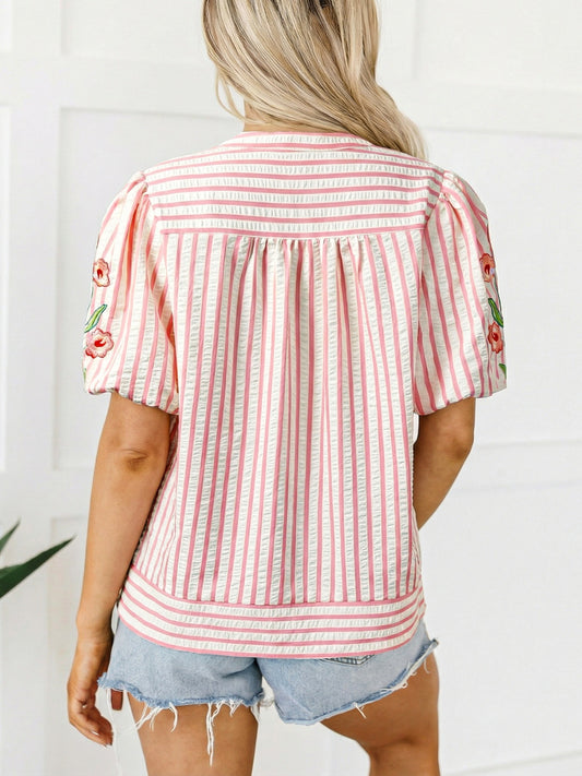 Stripe Print Floral Embroidered Puff Sleeve V Neck Blouse
