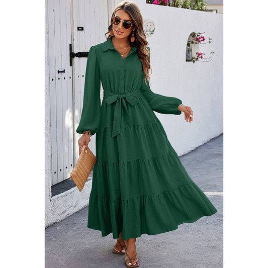 Color Block Belt Button Ruffle Solid Full Dress