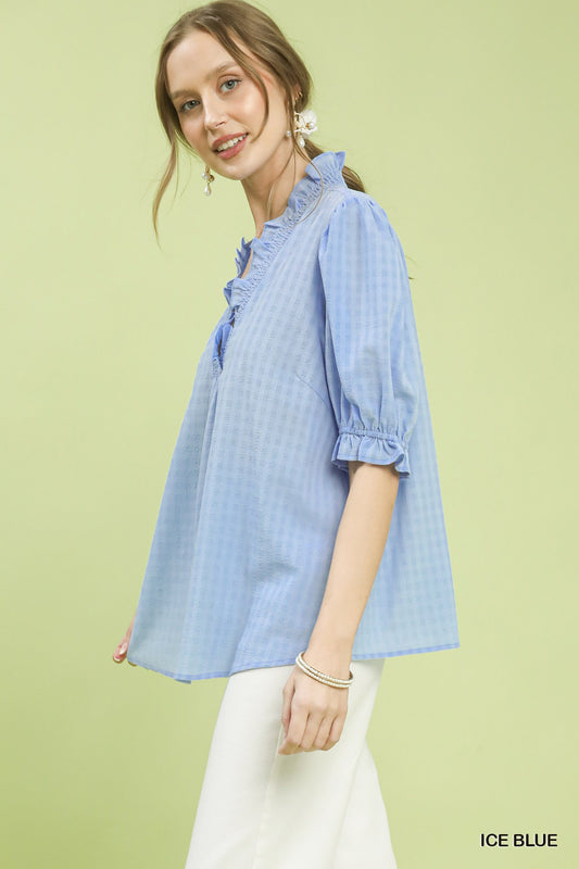 Textured Check Ruffle V-Neck Blouse