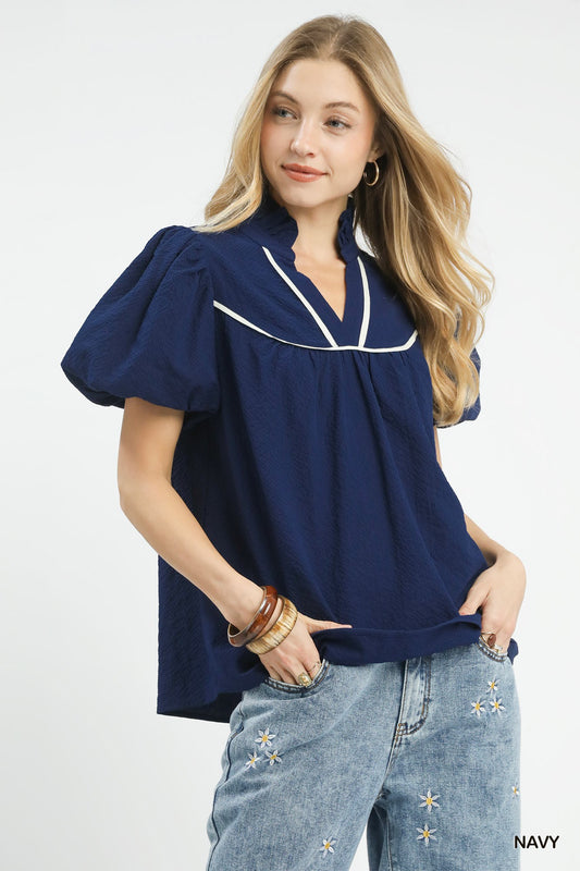 Textured Split Neck Puff Sleeve Top