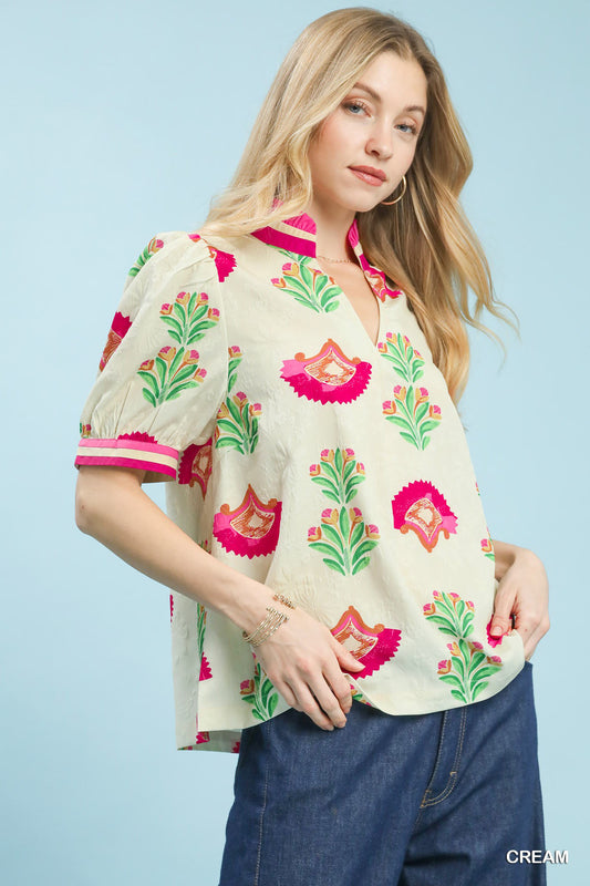 Print Puff Sleeve Blouse with Contrast Trim