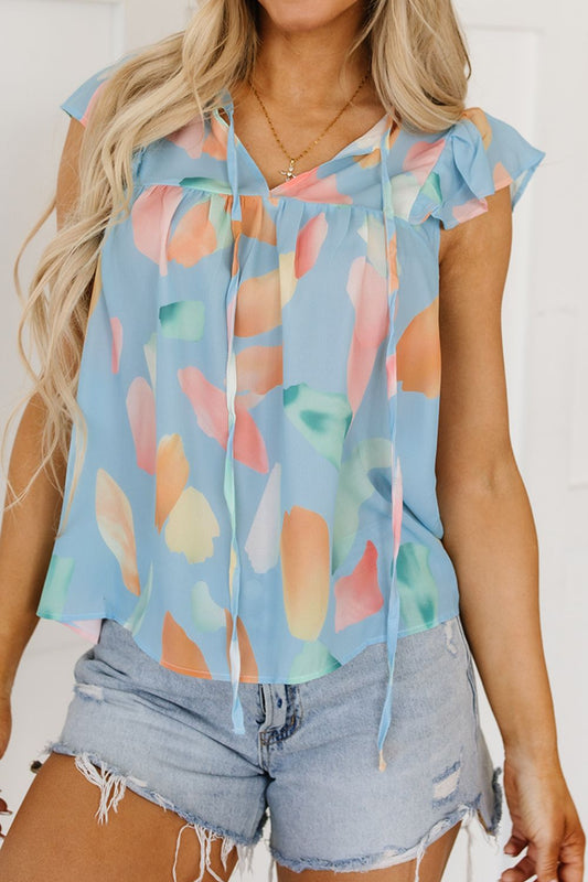 Splotches Pattern Ruffled Cap Sleeve Blouse