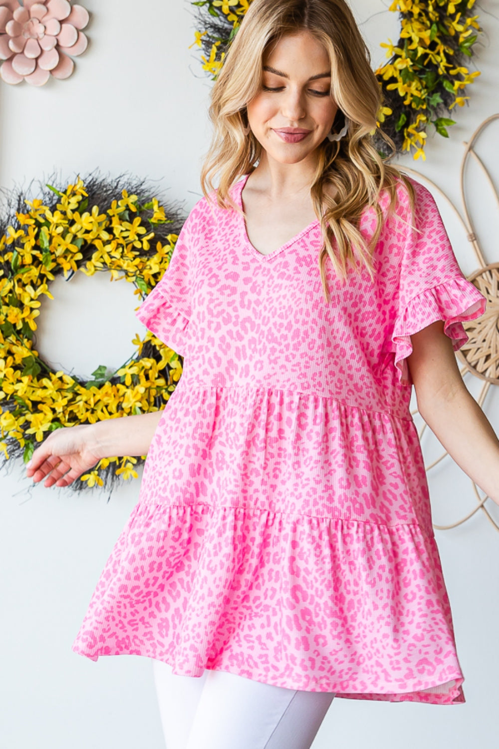 Heimish Full Size Leopard Ruffle Trim Short Sleeve Top