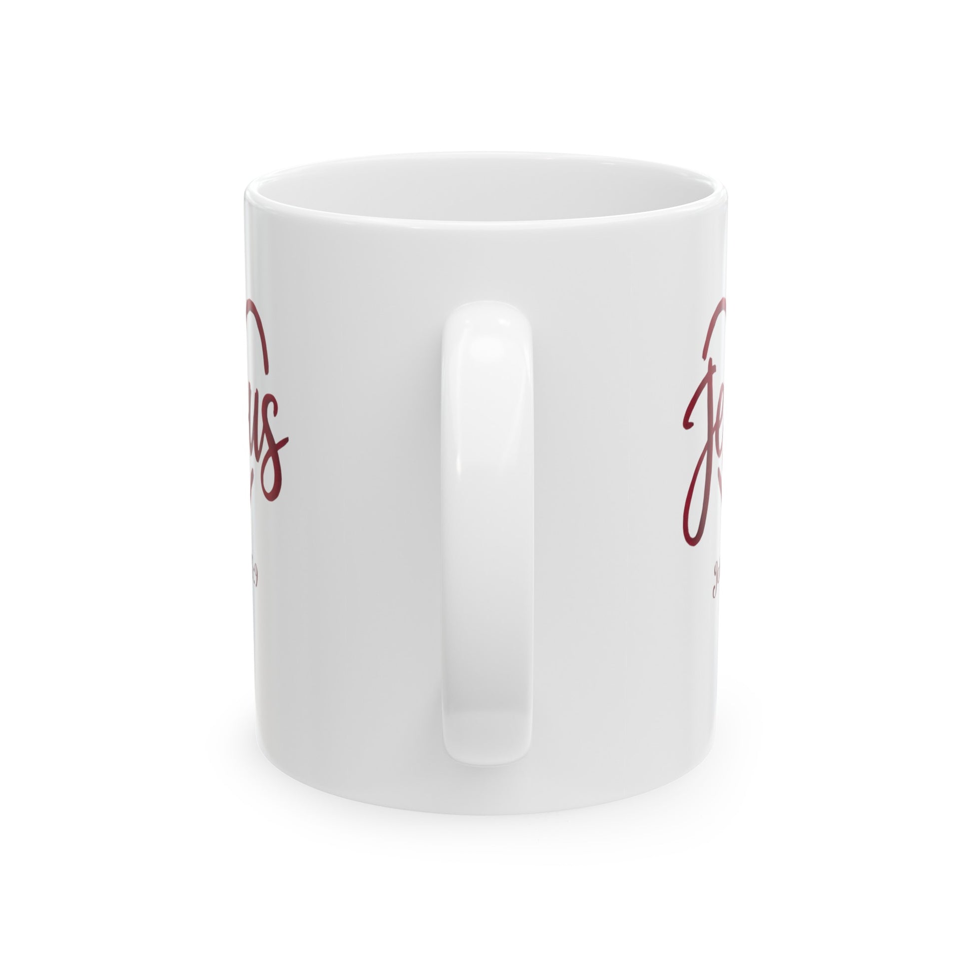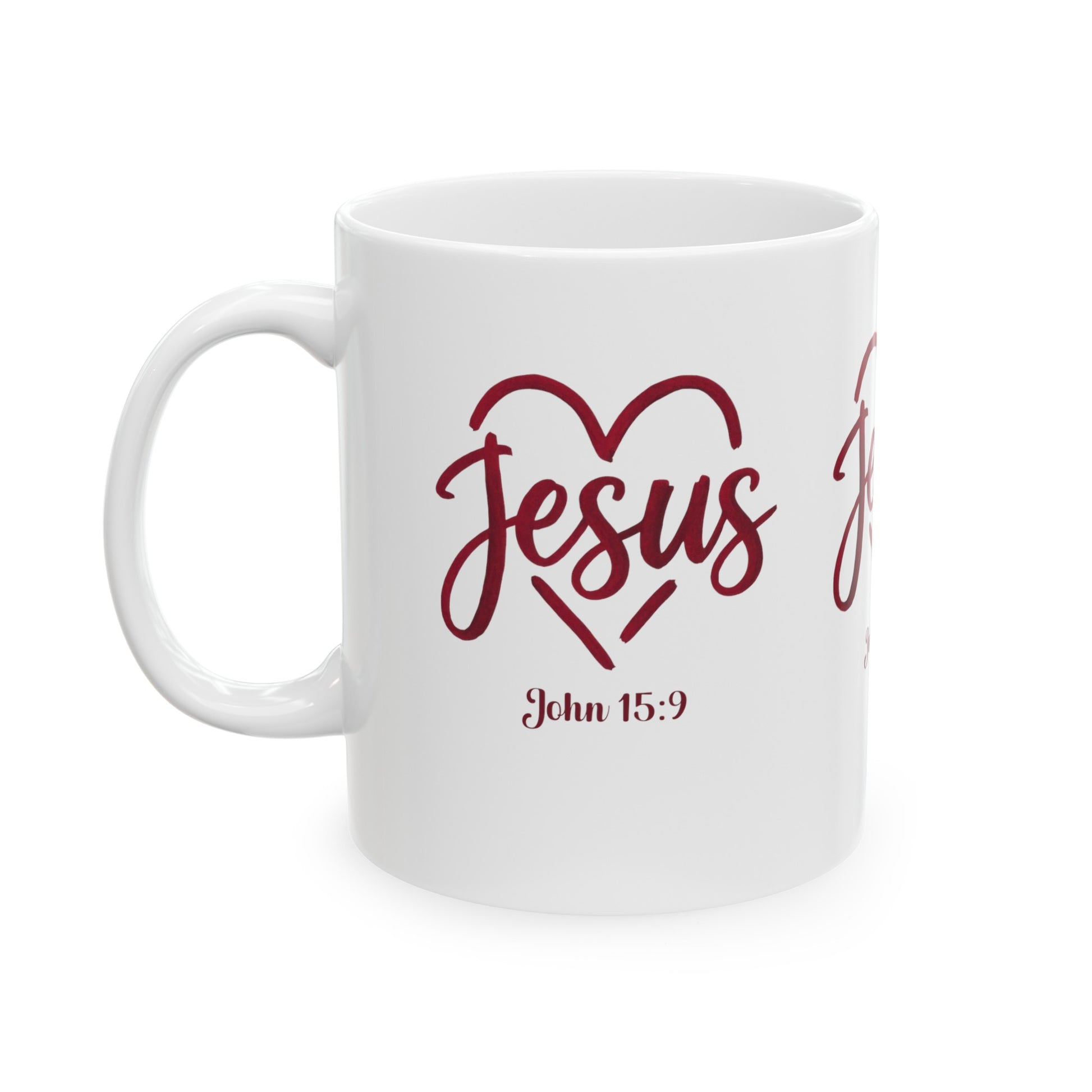 Start your day with inspiration using our "Jesus" mug, featuring a heart behind the word Jesus and the verse John 15:9 to remind you of His enduring love.